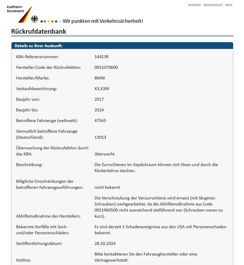 Podle zjištění webu kfz-rueckrufe.de se svolávací akce týká také 103.824 vozů v Německu. Jedná se o BMW X3 vybavené speciálním paketem pro ukládání zavazadel (SA 493) a bez speciálního rezervního kola (SA 300). Výměna šroubových spojů upevňovacích lišt v zavazadlovém prostoru podle něj trvá přibližně 15 minut. V případě nárazu zezadu při rychlosti nad 80 km/h toto opatření zabrání posunu upevňovacích lišt, čímž se zabrání potenciálnímu riziku zranění cestujících na zadních sedadlech.